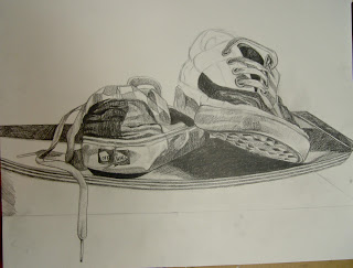 The first assignment for Drawing II was to create a study of any object. For this broad topic it seems that common choice is shoes, but I love my Vans and they were what I decided would be the most fun out of the all the objects I was deciding between. I set them up on the chair in my room for the weekend, and my little light down by them for greater contrast! I used nero lead, which I really like since it will go quite dark, but it is a little harder to erase out highlights. These are a few shots of my process!